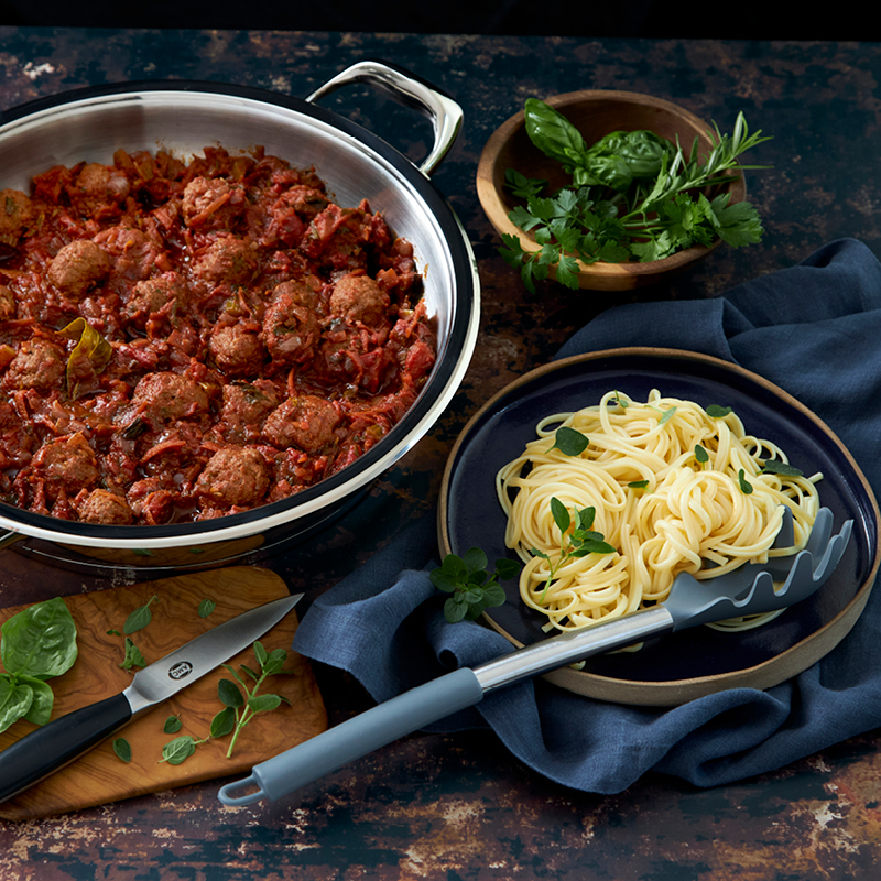 - While the meatballs are cooking, bring your AMC 24 cm Gourmet High with enough water and some salt added, to the boil.